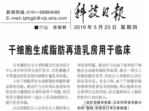 《科技日報》:干細胞生成脂肪再造乳房用于臨床