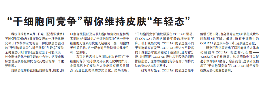 科技日報北京4月3日電(記者張夢然)英國《自然》雜志3日在線發(fā)表的一項老化研究稱,日本科學(xué)家發(fā)現(xiàn)由一種膠原蛋白驅(qū)動的“干細胞…