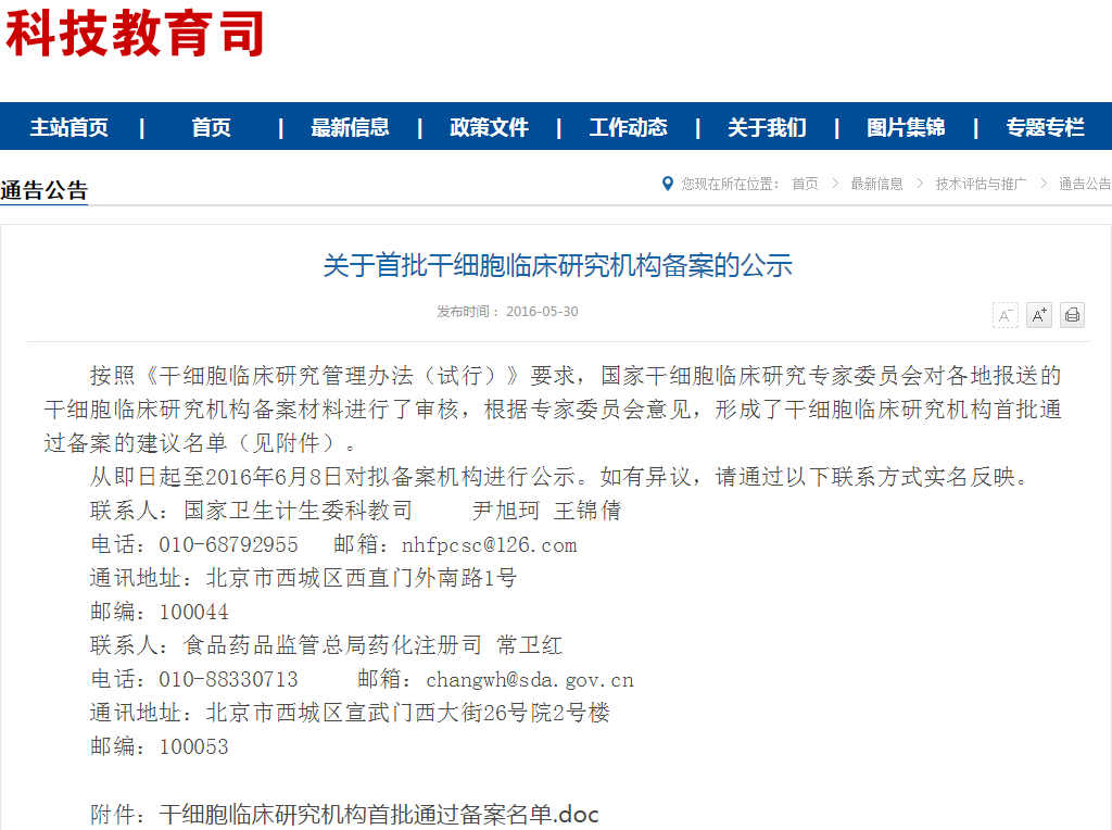 關(guān)于首批干細(xì)胞臨床研究機(jī)構(gòu)備案的公示