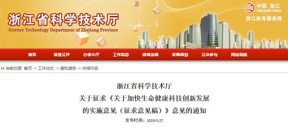 2019年5月27日,浙江省科學(xué)技術(shù)廳在其官網(wǎng)正式發(fā)布《關(guān)于加快生命健康科技創(chuàng)新發(fā)展的實施意見(征求意見稿)》,征求意見稿中提到:加強政策保障。在國際醫(yī)療旅游先行區(qū)、自貿(mào)區(qū)以及具有良好發(fā)展基礎(chǔ)的區(qū)域先行先試,科學(xué)穩(wěn)妥地推進細胞治療技術(shù)創(chuàng)新發(fā)展試點。…