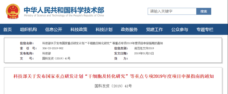 2019年1月21日,我國(guó)科技部官網(wǎng)正式發(fā)布了“干細(xì)胞及轉(zhuǎn)化研究”重點(diǎn)專項(xiàng)2019年度項(xiàng)目申報(bào)指南,指南中明確:在之前已支持98個(gè)項(xiàng)目的基礎(chǔ)上,2019年國(guó)家再撥款4億元,支持12個(gè)干細(xì)胞研究方向。其中干細(xì)胞資源庫(kù)、干細(xì)胞治療性腺衰老也寫入申報(bào)指南。指南中明確…